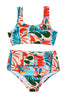 This two piece swimsuit features a bright tropical print, translated from a one-of-a-kind painting by acclaimed surf artist, Andy Davis.