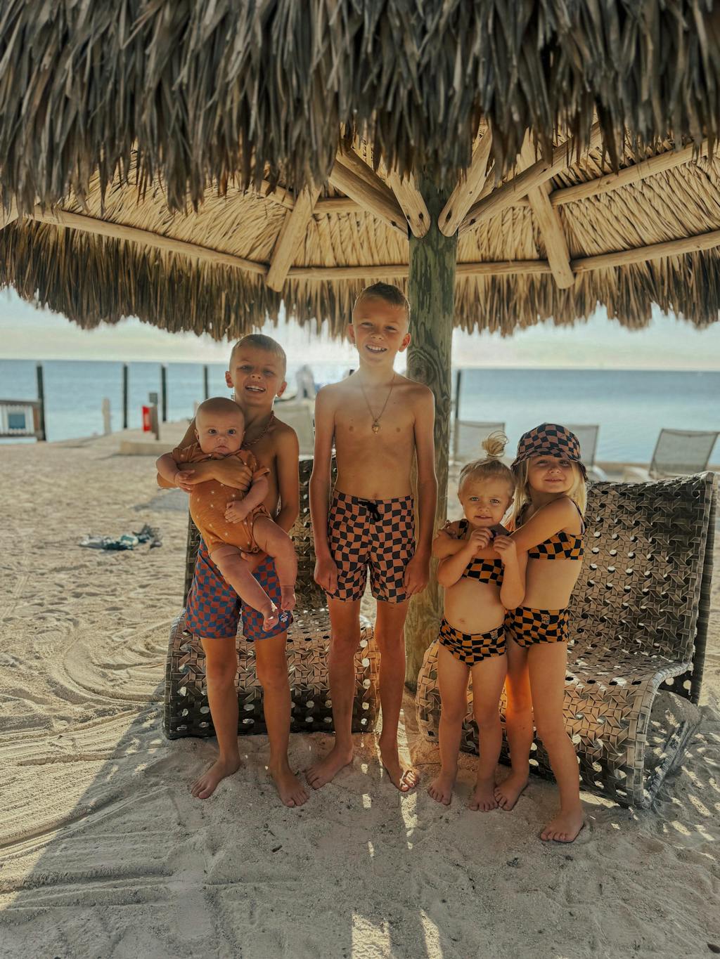 Our boys boardshorts are crafted from a premium blend of organic cotton (52%) and recycled polyester (48%), offering a soft feel with quick-dry performance. We consciously avoid excess materials—no metal hardware or plastic drawstring tips—just clean design and planet-friendly choices.
