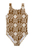 This one piece swimsuit features a tropical checker print, featuring beach-inspired sketches by our artist friend, Wendy Choi.