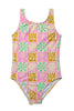 This one piece swimsuit features a tropical checker print, featuring beach-inspired sketches by our artist friend, Wendy Choi.
